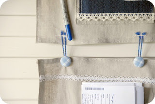 The top pocket is for bills to be paid and a little pen and holder....the bottom pocket is for bills that have been paid and a little hanger with pegs to stick things like stamps and other items